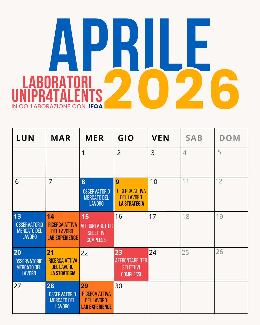 Parma, 24 marzo 2026 – È disponibile il calendario di aprile dei laboratori di orientamento al lavoro Unipr4Talents, in collaborazione con IFOA: un supporto mirato per trasformare il proprio obiettivo professionale in un piano concreto con un percorso pratico e guidato.